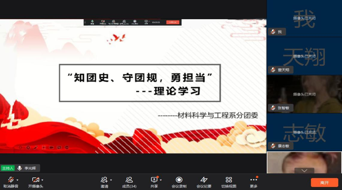 为加强团员的思想建设,增强团支部的凝聚力,确保支部在建设和发展上提质增效,同时深入学习贯彻习近平总书记给中国冰雪健儿重要回信精神,有效运用冬奥中的育人元素,深度挖掘宝贵的育人价值,材料科学与工程系分团委于2022年4月16日18点40分利用钉钉会议在线上开展了以“知团史、守团规,勇担当”为主题的理论学习,各班团支部委员参加了本次会议,会议由分团委宣传委员李光辉主持。