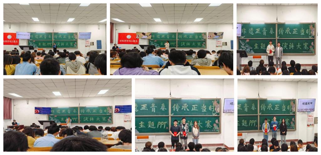 本次主题PPT大赛经过初赛的选拔,最终有5组选手脱颖而出参与决赛,材料系学生会各部门负责人担任此次决赛评委。其中姜行磊同学分享了古老的汉字的书写艺术中国书法,展现了中国书法独特的视觉艺术魅力;粱富强同学从京剧的历史渊源、表演特点、传承现状等方面进行了介绍,阐释了中国国粹京剧的特点;张沛同学对中国传统的民间表演艺术舞狮进行了讲解展示,让同学们感受到了舞狮形式的独特魅力和深厚底蕴。杨智琦同学演唱的中场节目《英雄归来》调动了同学们的热情,引发阵阵欢呼。经过激烈的角逐,最后姜行磊同学荣获一等奖,张沛和李晨欣同学荣获二等奖,高钰星和粱富强荣获三等奖。