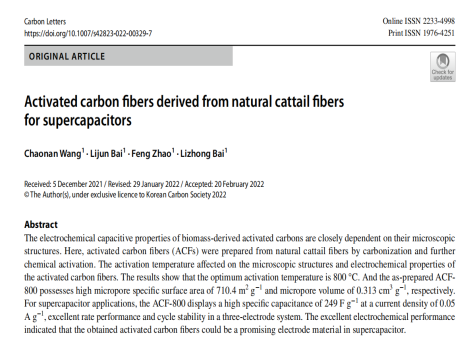 该工作以标题为 “Activated carbon fbers derived from natural cattail fbers for supercapacitors” 发表在国际知名期刊《Carbon Letters》上,第一作者为王超男, 通讯作者为白利忠副教授。