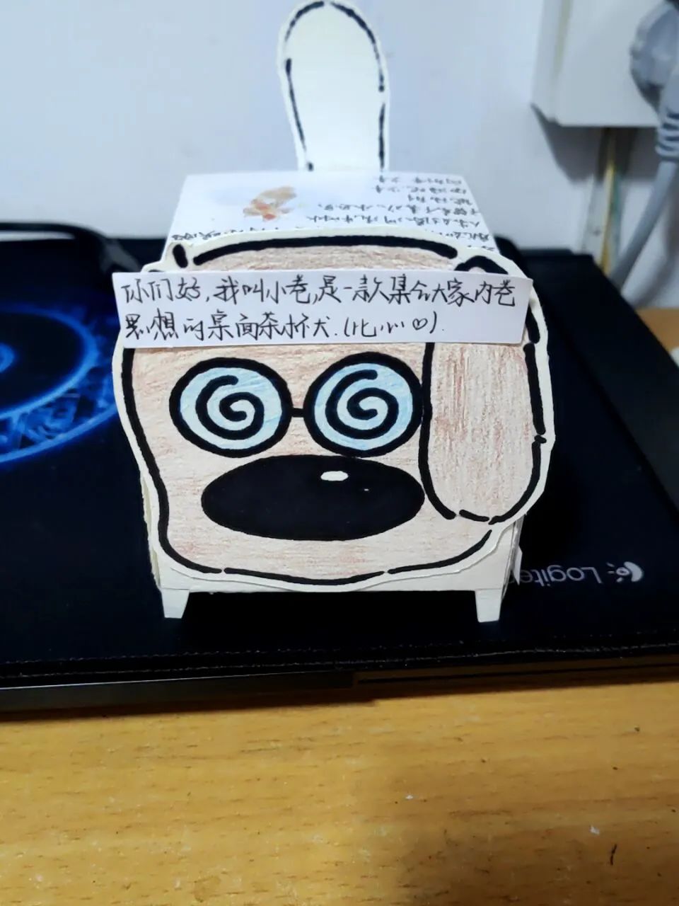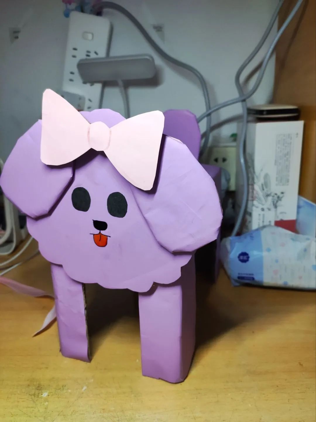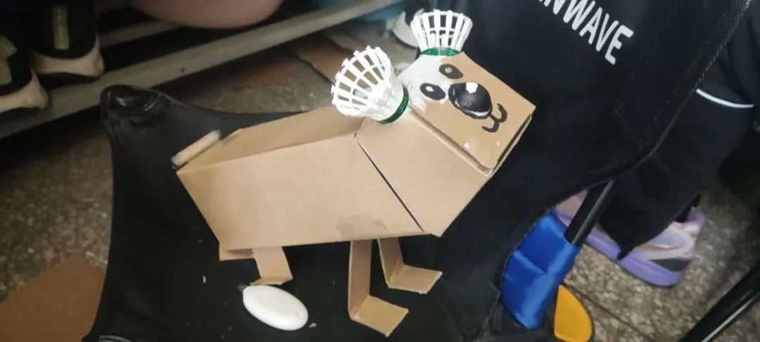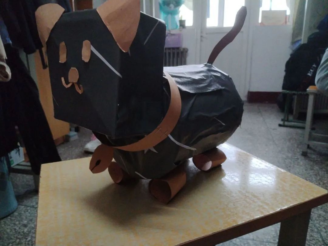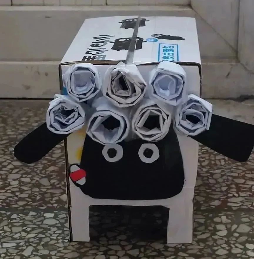 22材料科学与工程4班武宇欣因为自己很喜欢小羊肖恩,想做一个当萌宠,小羊的身子是由一个主调为黑白的箱子做成,符合羊的样貌,卷毛是由几张废纸卷成粘在了一起,耳朵和脸由卡纸剪成。