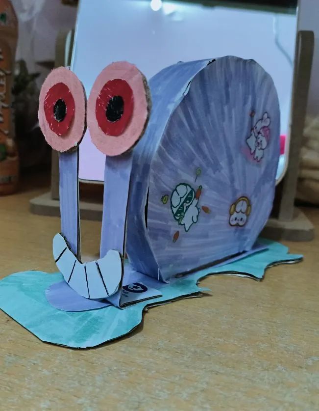 22材料成型及控制工程1班张姝彤的作品该作品原型是动画片《海绵宝宝》中的小蜗,一只会喵喵叫的蜗牛,同时跟海绵宝宝也是好朋友。该动画是我们童年的回忆,特以小窝为原型制作该作品,愿自己能够保留一颗童心。
