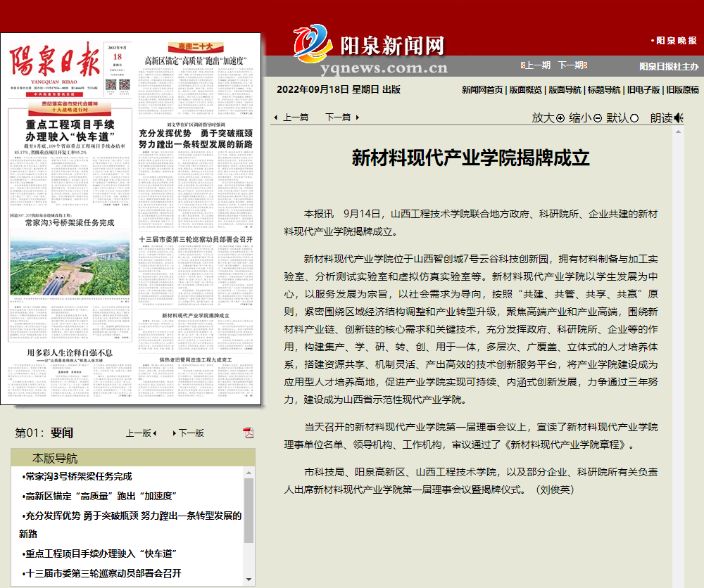 (阳泉日报2022年9月18日报道ac米兰新材料现代产业学院揭牌成立)