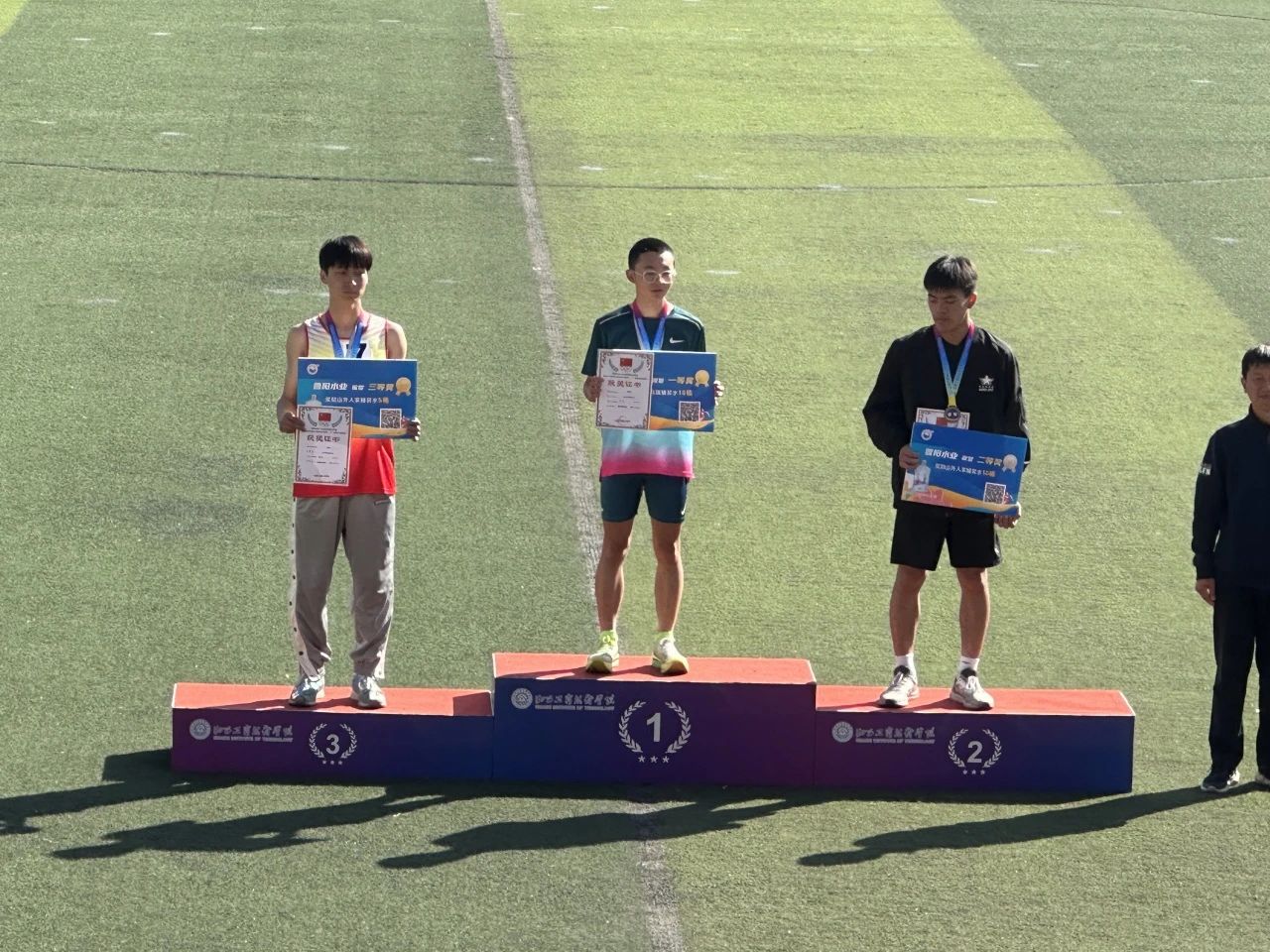在激烈的竞争中,我系运动员陈炫亦脱颖而出。他不仅速度快、耐力强,而且始终保持着良好的心态。他的每一步都充满了力量和自信,仿佛在告诉所有人:他就是那个能够打破纪录的人!在最后的冲刺阶段,他更是展现出了惊人的毅力。他以惊人的速度冲向终点线,赢得了比赛的胜利并打破了校纪录!全场都为这位英雄欢呼喝彩!