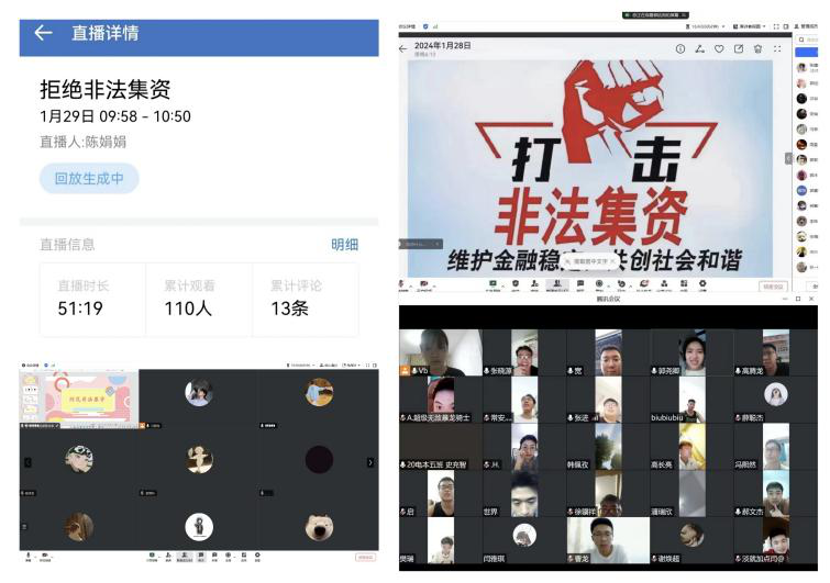 在开展防范非法集资教育活动中,电气系采用了许多种形式和方法,电气系全部班级召开了线上班会开展专题学习,利用在微信公众号平台和抖音平台发布相关宣传内容。通过这些多样化的方式来激发学生的学习兴趣,提高大家的积极性,从而始大家的防范意识得到提升。此次活动过程中,微信平台上“ac米兰官方网站电气小微”发表两则有关防范非法集资的通讯,阅览量1109人。同时积极调动电气系各班级同学积极转发,让更多人可以了解什么是非法集资,非法集资的常见骗术有哪些,让大家了解如何预防非法集资,全系46个班级,共计1531名同学均积极参与。在抖音短视频平台电气与控制工程系官方账号上发表了有关防范非法集资的宣传图文集,其中浏览量为1561,转发量为121。