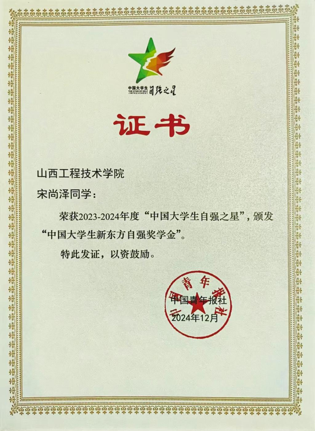近日,由共青团中央、全国学联指导,团中央基层建设部、中国青年报社主办的2023—2024年度“中国大学生自强之星”奖学金推选工作圆满结束。学院电气与控制工程系学生宋尚泽荣获“中国大学生自强之星”称号,这是学院学生继2021年后再次荣获此项荣誉。