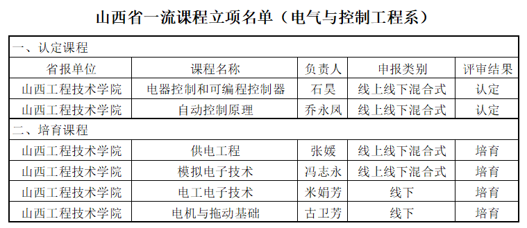 根据山西省教育厅发布的《关于公布2024年山西省一流课程立项名单的通知》(晋教高〔2024〕6号)文件,电气系《自动控制原理》荣获2024年度省级一流课程的认定课程,这不仅是对教学改革和课程创新工作的肯定,也是对教学质量和教学成果的高度认可。同时,《供电工程》、《模拟电子技术》、《电工电子技术》以及《电机与拖动基础》四门课程被列为培育课程。