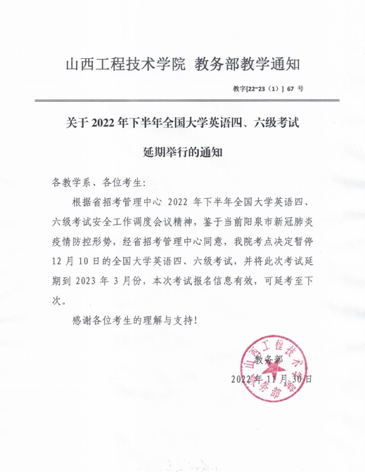 关于2022年下半年全国大学四、六级考试延期举行的通知