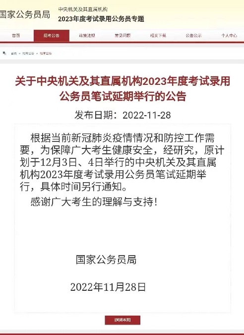 关于中央机关及其直属机构2023年度考试录用公务员笔试延期举行的公告