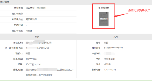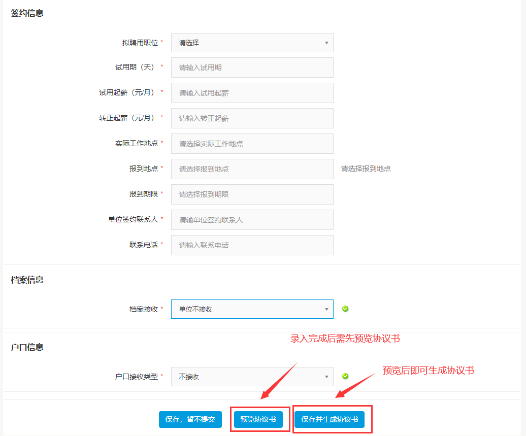 点击【录入协议书】按钮进入信息填写页面,填写完成之后需先点击【预览协议书】,确认协议书无误后即可点击【保存并生成协议书】。