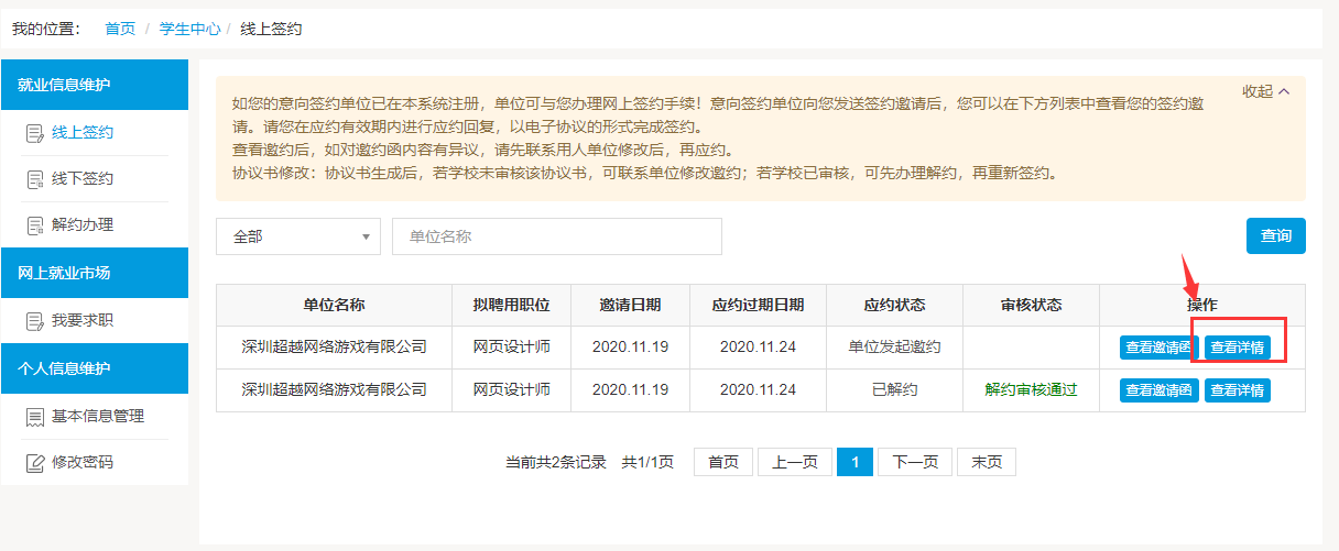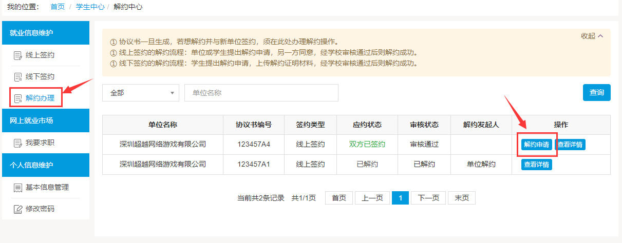 学生在【解约中心】模块中可对当前签约单位发起解约。