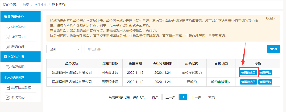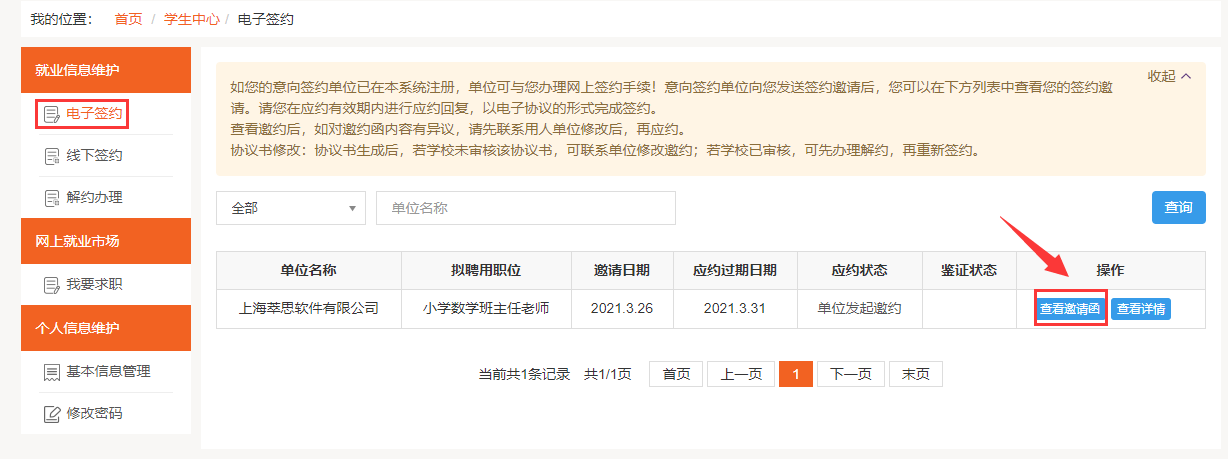 在【线上签约】模块中可查看单位发起的签约邀请函。