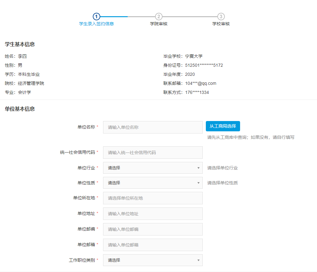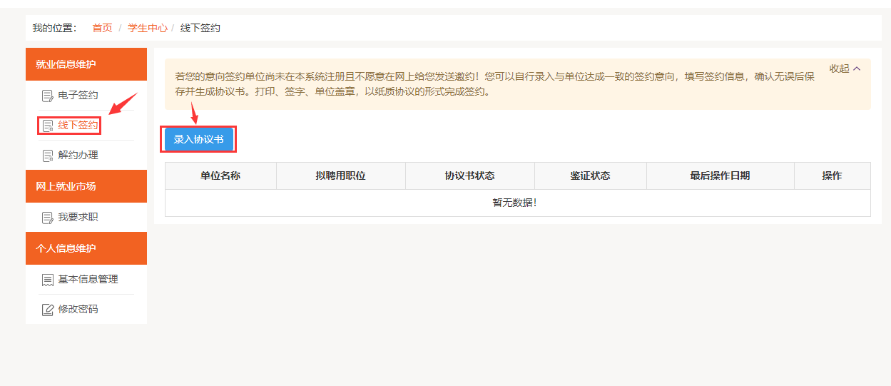 当单位无法线上发起邀约时,学生可通过线下签约的形式自行录入协议书信息。