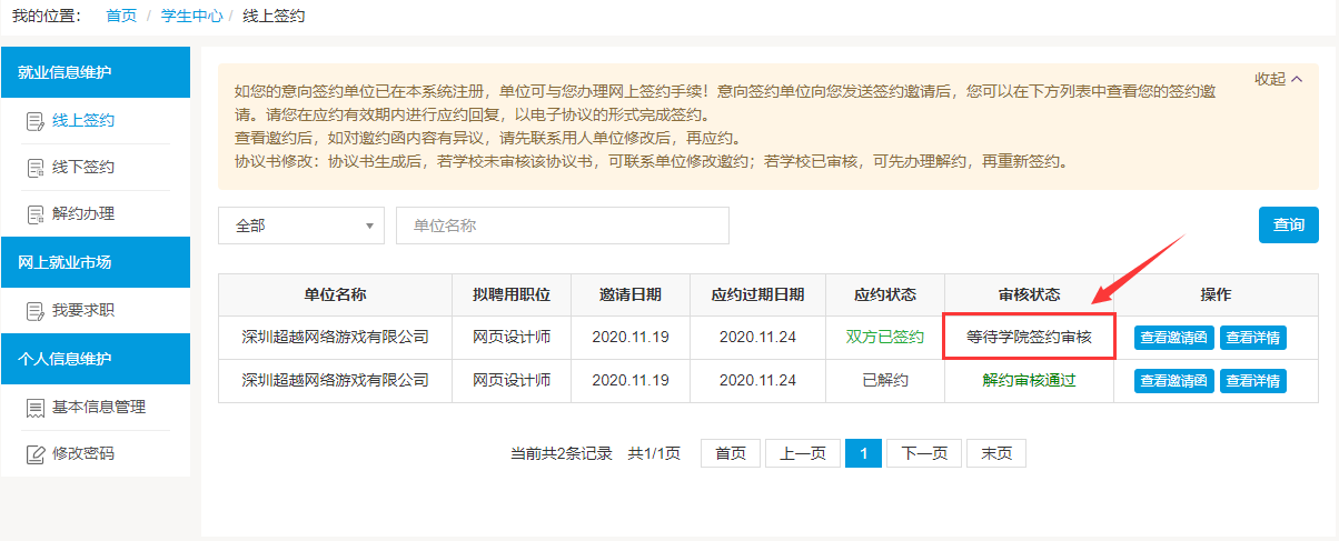 协议书生成后审核状态变为待审状态,学生可在查看详情在下载打印协议书,打印盖章后可以重新上传。