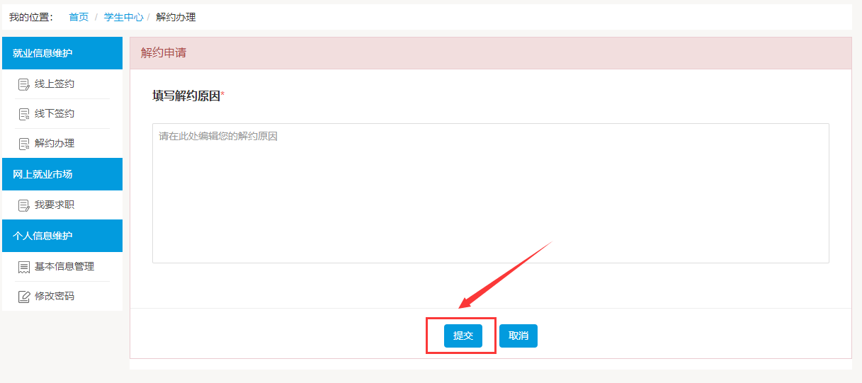 点击【解约申请】按钮后填写解约原因,填写完成后点击提交,等待单位同意解约院校审核。