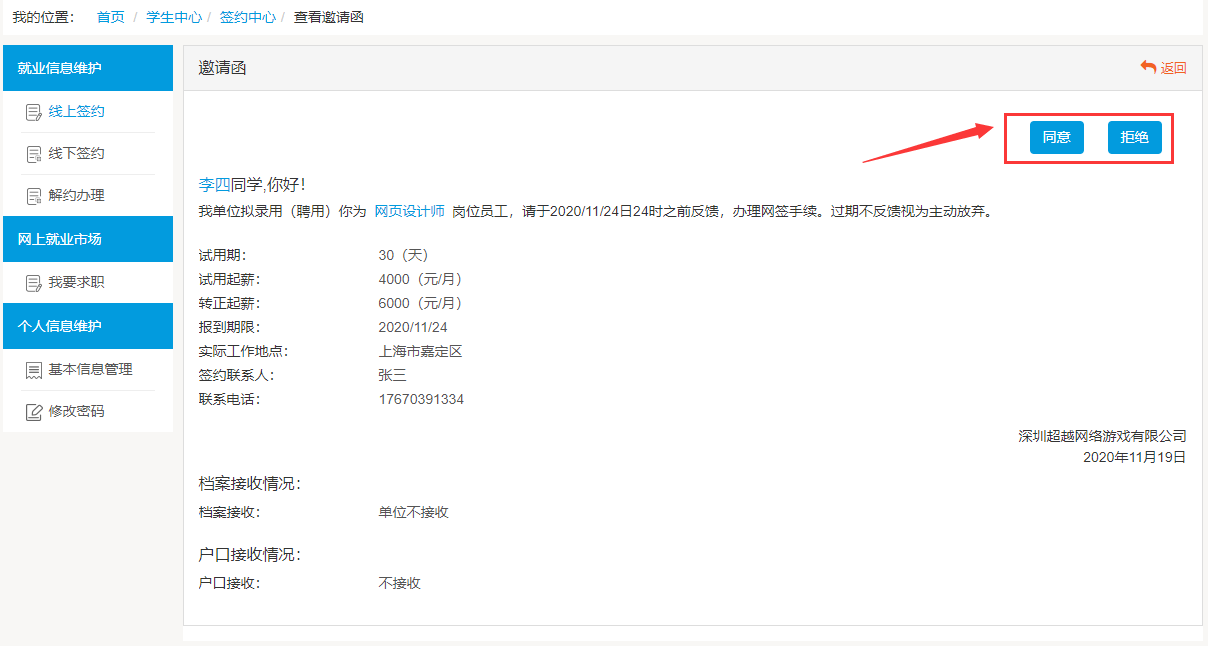 学生和单位达成签约意向,单位同意线上签约, 其流程如下: