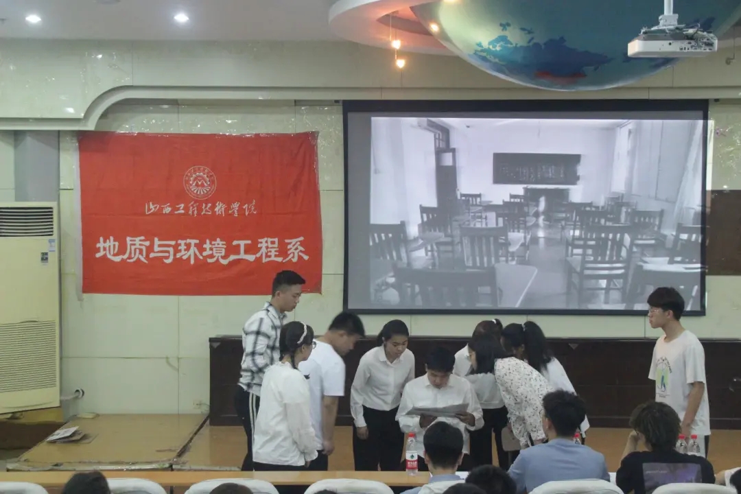 百年征程,波澜壮阔,为庆祝中国共产党成立100周年,深入贯彻落实习近平新时代中国特色社会主义思想,进一步让青年学子将“学党史、强信念、跟党走”内化于心,外化于行。在经过一周多的准备后,地质与环境工程系以“重温光辉历程,感悟初心使命”为主题的情景剧复赛于2021年5月9日晚19时在思贤楼九层进入我们的眼帘。
