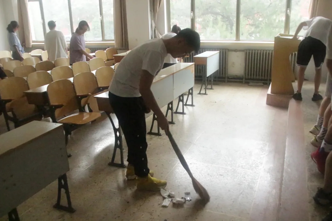 本次打扫的地点主要是勤学楼的教室。尽管天气闷热但地环系学子的打扫热情丝毫未减。活动开始,大家集合完毕后由分团委成员带领各专业到达指定教室,大家用自带的工具把主教的垃圾很快清扫干净,黑板也擦的亮堂。经过大家的努力,教室很快焕然一新,呈现出整洁亮丽、活泼清新的新气象。热火朝天的打扫现场,充分展现了地环系学子阳光向上、精神饱满的良好状态。在大家齐心协力的合作下,终于将主教上下打扫的干干净净。活动结束以后,大家合影留念。