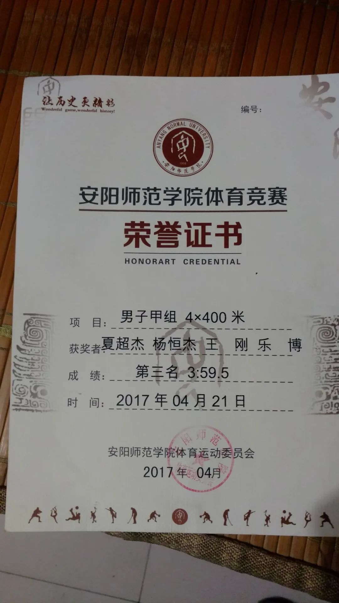高光时刻应属于2017年的4*400男子团体接力比赛。小组预赛时,我第三棒,在最后100米时连追3人,在最后交给博哥时,已经是小组第一了。剩下的就很轻松了,以小组第一的成绩进入到了决赛。4月21日下午15:00,挺晒的天气当时,菊园219的仨人和小一届的学弟迎接决赛的挑战。我晓得我是这里面最大的短板,让一名耐力性选手干冲刺的活,的确为难俺了。不过结果是不错的,俺四个都咬紧牙关,向领奖台发起冲击。最终结果是3分59秒5,获得全校第三名,这也终于圆了站上领奖台的梦想。