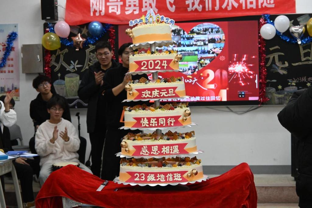 值得一提的是,本次晚会设计了两个蛋糕环节。其一是为范勇喆同学庆祝即将来临的生日,全班同学为他共唱生日歌并送上祝福。其二是纪念全班同学相遇的100天,每一位同学认真许愿,再由辅导员王刚老师吹灭蜡烛,也希望23地信班的全体同学都能越来越好。