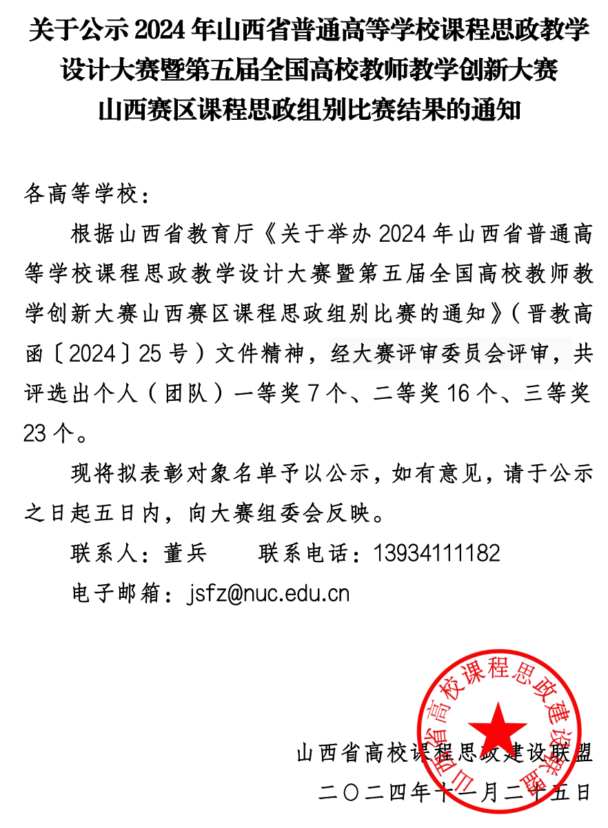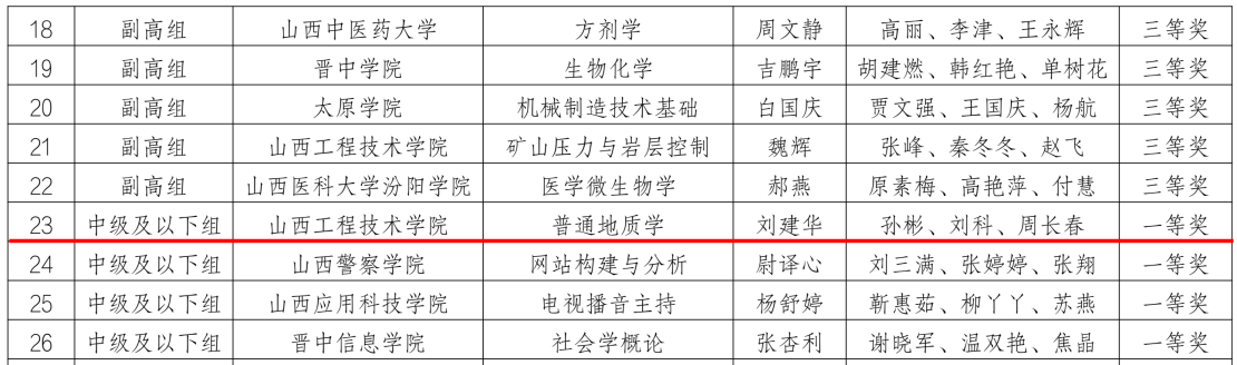 近日,根据山西省高校课程思政建设联盟公布的《关于公示2024年山西省普通高等学校课程思政教学设计大赛暨第五届全国高校教师教学创新大赛山西赛区课程思政组别比赛结果的通知》,ac米兰地球科学与工程系刘建华教师团队荣获中级及以下组省级一等奖,拟推荐参加第五届全国高校教师教学创新大赛课程思政组比赛,取得了ac米兰教师参加教师教学创新大赛的新突破。