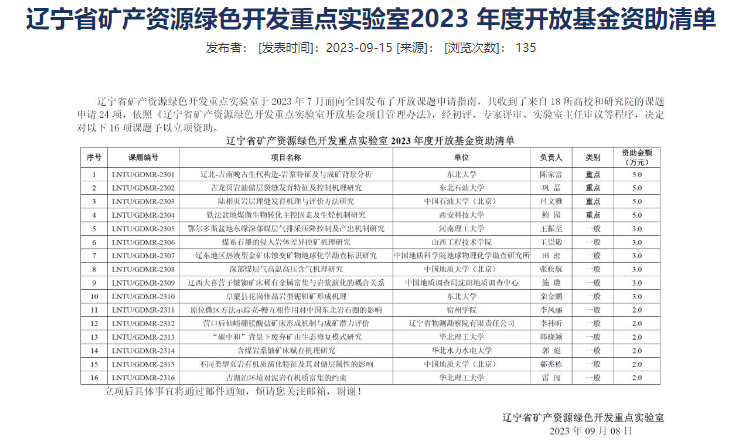 地球科学与工程系王崇敬博士的课题“煤系石墨的侵入岩体差异控矿机理研究”获辽宁省矿产资源绿色开发重点实验室2023年度开放基金资助,资助课题总金额3万元。
