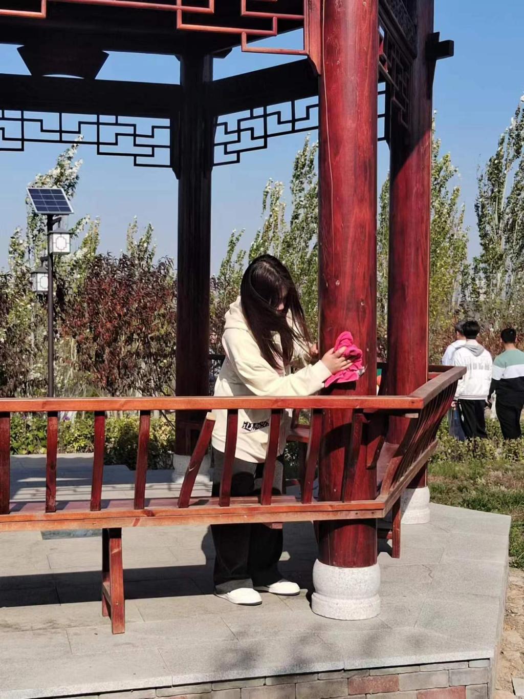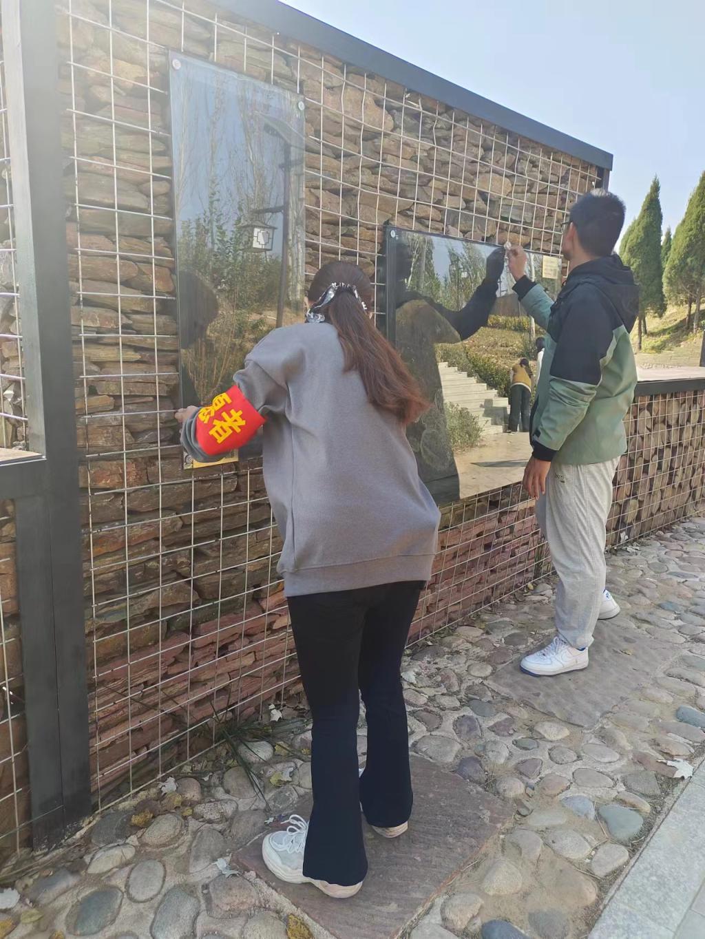 中午12点整,参与活动的志愿者与工作人员准时在地质文化园南门集合,由权益部成员对志愿者进行点名签到。同学们按照分团委所划分的区域进行分工,携带了不同的劳动工具:抹布、扫帚、簸箕、垃圾袋等,本次打扫的主要任务是清扫地质文化园内的落叶与擦拭化石墙区域的玻璃罩。清理过程中,大家热情高涨、合作默契,发扬不怕苦、不怕累的精神,俯下身子、撸起袖子,细致的清理灌木丛、花坛、墙角等卫生死角,让地质文化园焕然一新。打扫结束后,同学们一起举起系旗合影。