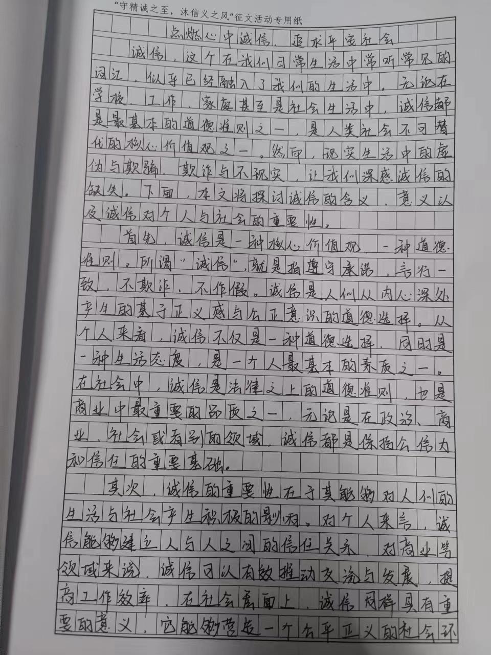 诚信是交往的桥梁,各系同学们积极参与本次征文活动,用笔书写出自己对诚信的理解并深刻感受到诚信在我们日常学习生活中的重要性,真正做到与诚信同行,用笔彰显灵魂的美德之花!