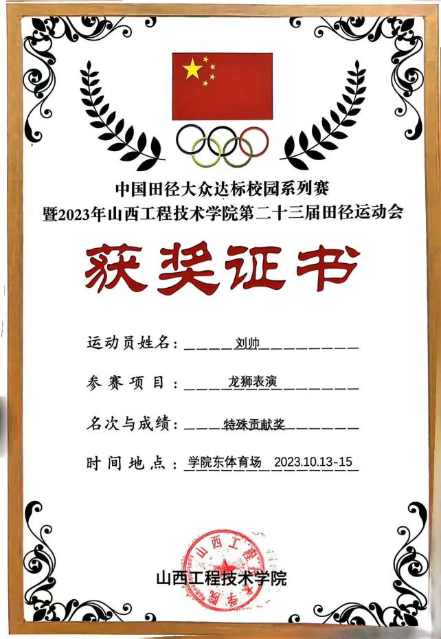 刘帅同学在中国田径大众达标系列赛中荣获特殊贡献奖。