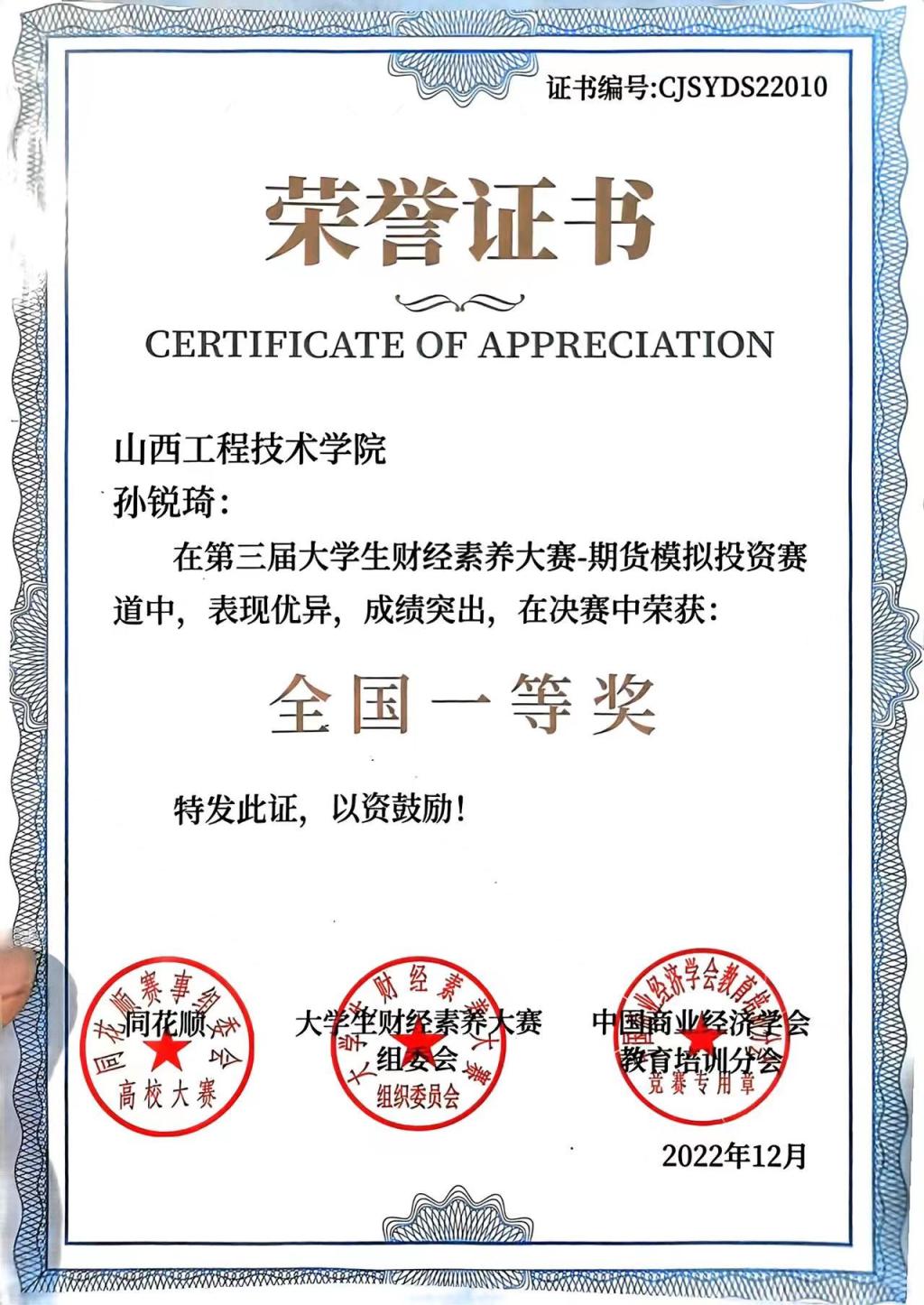 孙锐琦同学在第三届大学生财经素养大赛——期货模拟投资大赛中荣获全国一等奖,在“DOU爱沁源”短视频大赛中荣获优秀奖,在ac米兰官方网站“决胜千荔”大赛中荣获优秀奖。