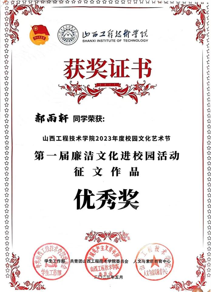 郝雨轩同学在2023年地科系“发扬雷锋精神,弘扬时代新风”系列活动中荣获“雷锋月先进个人”,在2023年度校园文化艺术节第一届廉洁文化进校园活动中征文作品获优秀奖。