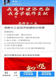 党群分工会于7月25日—7月30日开展了迎评促建线上答题活动。本次竞赛题目类型丰富,共有20个单选题,10个多选题,1个简答题。题目内容紧扣三本评建知识手册,答题时间40分钟,满分100分。共有45名教职工参与了答题活动,覆盖率达到了60%。