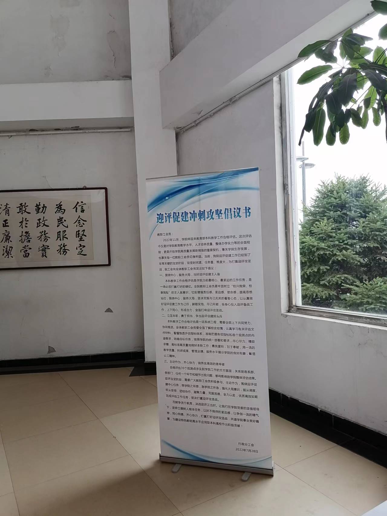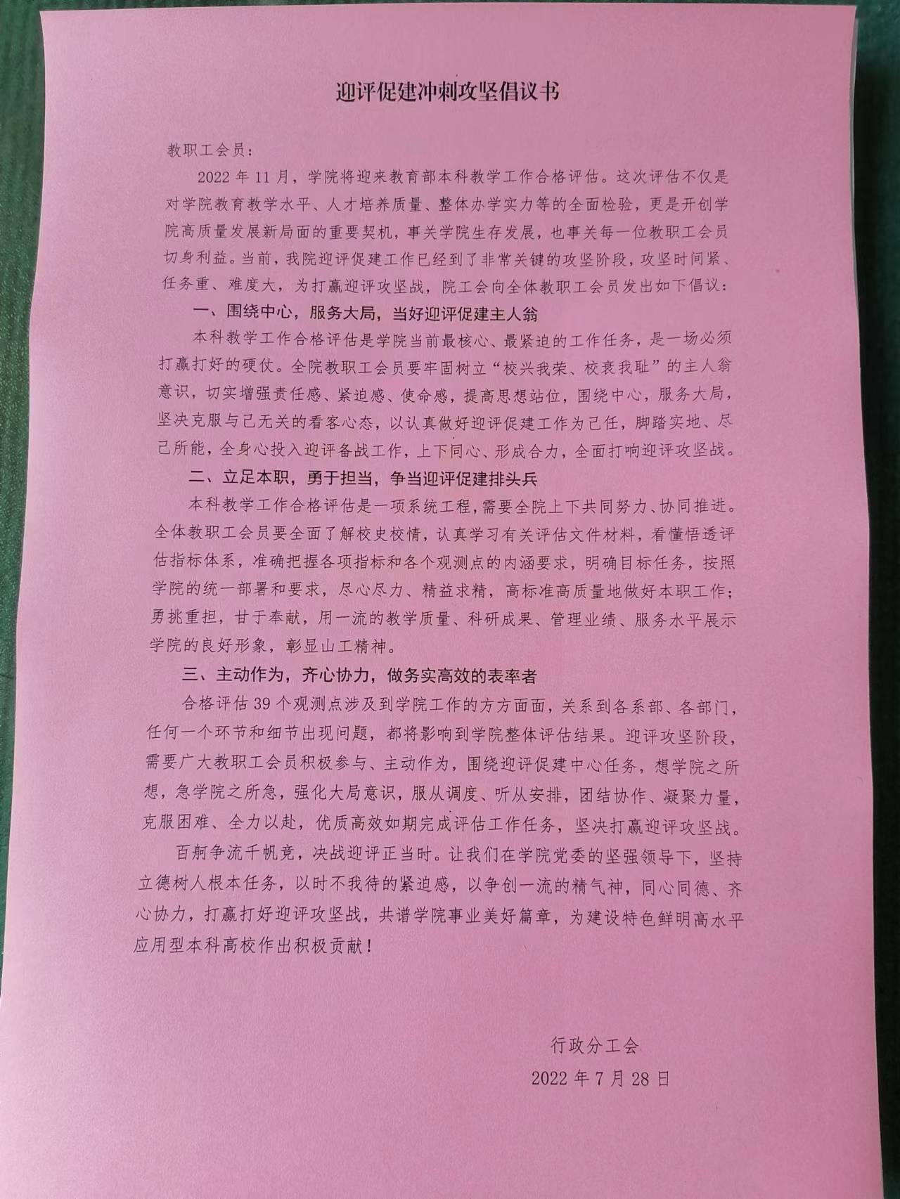 按照院工会《关于开展“我为评建添光彩我为学校作贡献”主题活动的实施方案》精神,为动员引导教职工齐心协力打赢迎评攻坚战,行政分工会制作了《迎评促建冲刺攻坚倡议书》宣传彩页和宣传展板,以此动员鼓舞大家,营造出“人人重视评估、人人参与评估、全力打赢迎评攻坚战”的浓厚氛围。