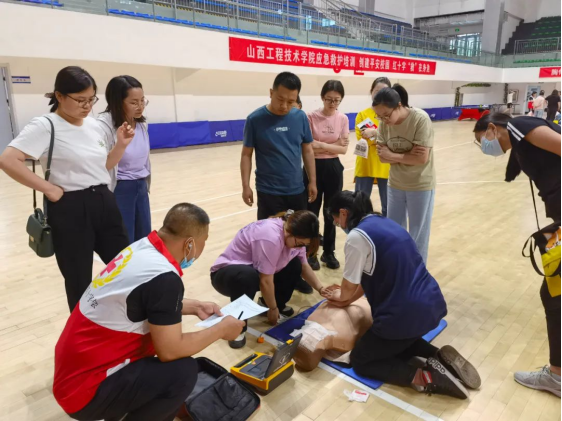 活动邀请阳泉市红十字会应急救护培训师资为学员们授课。老师通过图文并茂的形式,结合校园中发生的真实案例,向大家系统讲解了救护概论、心肺复苏术、AED的使用和创伤救护技术等急救技能,极大地激发了师生们学习的热情。在实操过程中,学员们听的仔细,学的认真,通过反复在人体模型上练习,基本掌握了心脏按压、人工呼吸、创伤救护包扎等基本救护技能。