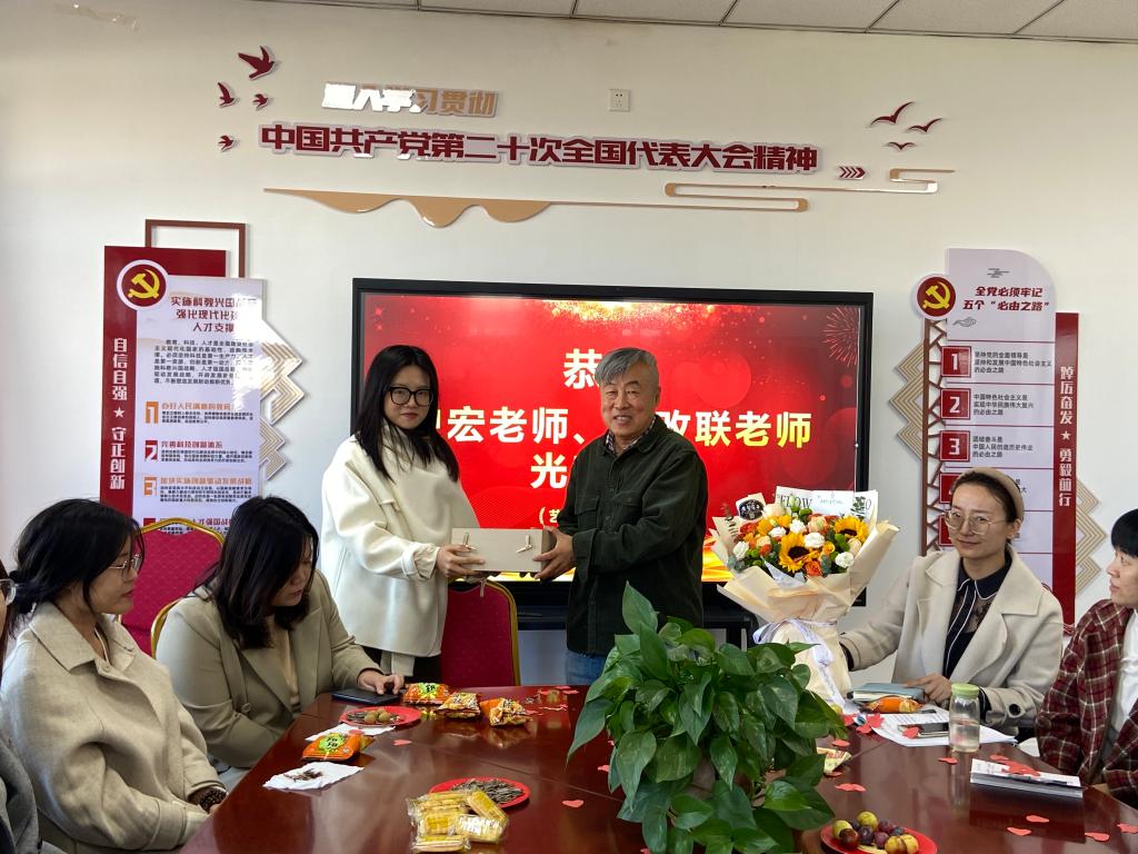 趁着这份温情,我系青年教师为史宏老师献上鲜花与纪念品。两位老师是青年教师的学习榜样,更是青年教师的引路人。夕阳无限好,晚霞别样红,祝两位老师人生中的第二个春天越来越美丽,也祝愿两位老师老有所为、荣休有乐、身体健康、阖家幸福!