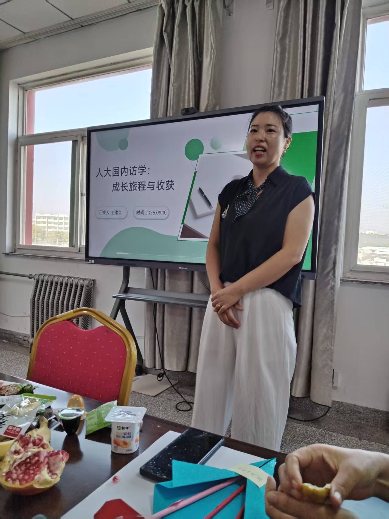 座谈会上,首先由刚从中国人民大学完成访问学者研修的王建荣老师分享了学习成果与感受。她谈到,人大的学术氛围十分浓厚,能够了解到最前沿的学术动态,学习到更创新的研究方法,领略一流高校课堂和讲座的交流讨论,让她对自己的研究方向有了更清晰的认识。她计划将人大的“案例教学”“实践导向”理念融入课程改革,设计相关选修课,实现“教学-研究”的双向赋能。她的分享使老师们感受颇深。