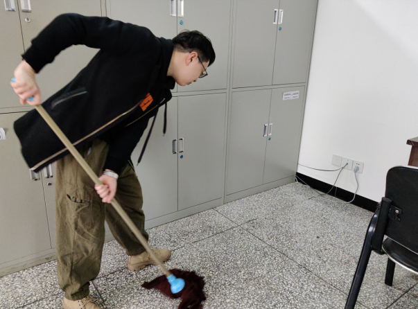 活动伊始,大家先到达思贤楼409报道,随后在我系党总支张素梅书记的带领下有序地开展办公室清扫和整理工作。活动中,各位党员、入党积极分子拿起扫帚、拖布和抹布打扫自己负责的区域,充分发扬不怕脏、不怕累的优良作风和团结协作的良好精神风貌。在清扫工作中,大家相互配合,有条不紊的打扫每个角落,确保卫生不留死角。