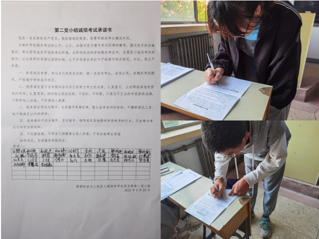 会议开始,通过轮流领学的方式带领大家学习了习近平总书记考察中国人民大学时的讲话、习近平总书记给南京大学留学归国青年学者的回信。通过学习,引起了同学们深深地思考,陈佳颖谈到:“习近平总书记对青年寄予的殷切期望让我备受鼓舞。立足新时代奋进新征程,青年学子沐浴成长在党的光辉之下,听党话跟党走早已融入自身发展的血脉之中。作为一名青年学子,我要将其牢记于心,做到内化于心、外化于行,践行使命、砥砺前行,努力学习专业知识。”之后,田鑫杰重点强调在即将到来的考试中自觉遵守考场纪律,身为党员、积极分子,要为其他同学做出表率,坚决杜绝各种考试舞弊行为,净化考场环境,展现自我的真实水平,用真实的成绩证明自己的实力,明确“诚信”的含义,做到知行合一。会议最后,大家纷纷表示要端正考试态度,当一名诚信考生,充分把握复习时间,认真准备,以诚信的态度对待每一场考试,以实力争取优异成绩,以诚信展现良好学风。此次会议更加坚定了同学们的信仰,振奋了同学们的精神,更有利于将社会主义核心价值观内化于心,外化于形。会议结束后于5月21日7:00在勤学楼211由王楚琪组织宣读《诚信考试承诺书》并要求每位同学郑重签署自己的名字。
