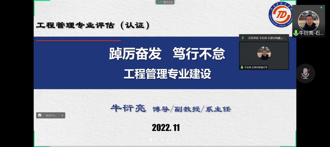 为加强专业评估(认证)知识的学习,管理科学与工程系于2022年11月28日特邀石家庄铁道大学管理科学与工程系主任、博士生导师牛衍亮副教授讲授“工程管理专业评估(认证)”的相关经验。受疫情影响,本次讲座在线上举行,并面向全院开放,会议由管理科学与工程系主任张文秀教授主持。