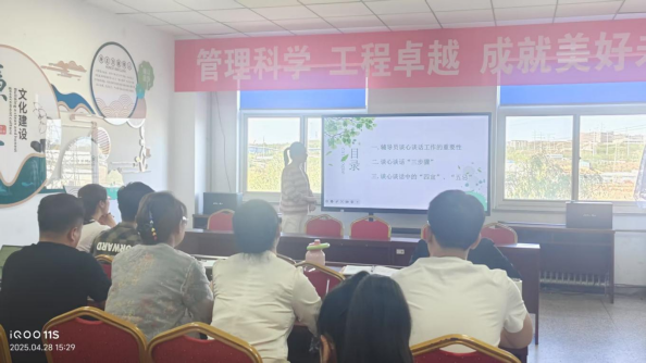 为提升辅导员育人能力,4月28日,管理科学与工程系在思贤楼411室开展“辅导员应如何开展好谈心谈话”专题培训,全体专兼职辅导员参会,主讲人为原慧老师。