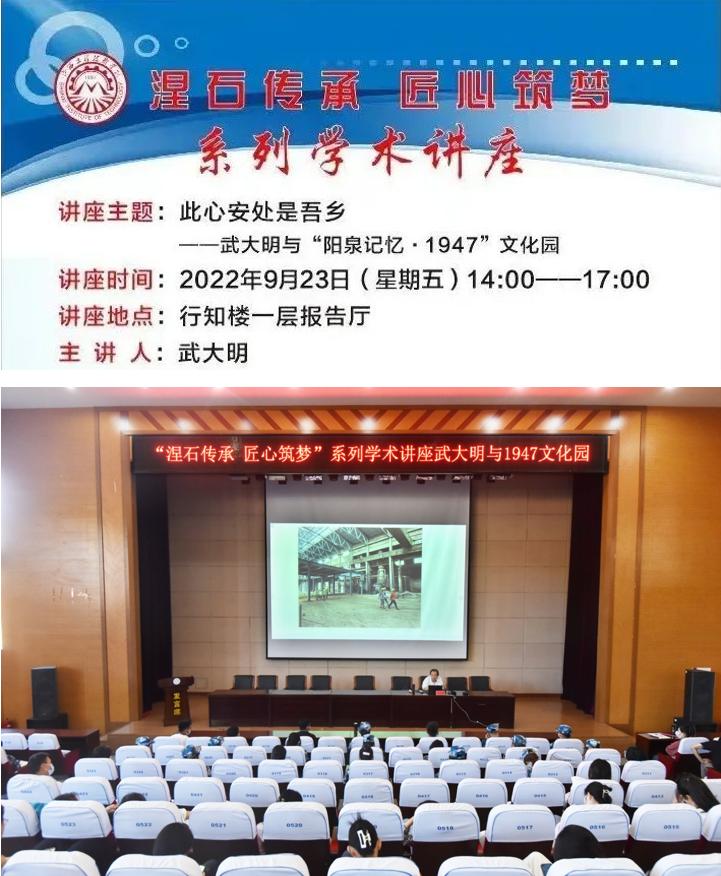 秉承ac米兰官方网站“涅石传承 匠心筑梦”系列学术讲座精神。为了推进了解阳泉地方的特色文化,领略工业生产中的美学,艺术与设计科学系特邀原山西大学油画系主任,武大明教授莅临讲座。9月23日,在行知楼报告厅进行“此心安处是吾乡——武大明与“阳泉记忆·1947”的主题讲座。在本次讲座中,武大明教授带领学院师生共同走进了“阳泉记忆·1947”文化园。让我们学院师生对它有了一个深刻的了解。