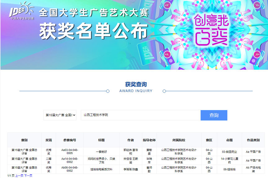 2023年第十五届全国大学生广告艺术大赛(简称“大广赛”)经过学校初评、赛区评选、全国总评审结果揭晓,我校艺术与设计科学系选出共54件优秀作品提交山西赛区。荣获国家二等奖1项、优秀奖2项;省级一等奖1项、二等奖2项、三等奖2项、优秀奖5项。本次参赛作品获奖作品总数创历年新高!