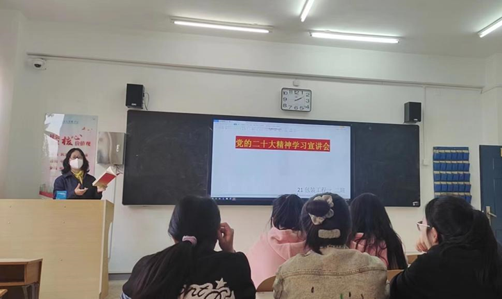 2023年3月20日下午2点,艺术系党总支郗改联副书记在勤学楼109给2021级包装工程一班、二班同学进行了党的二十大精神学习宣讲。