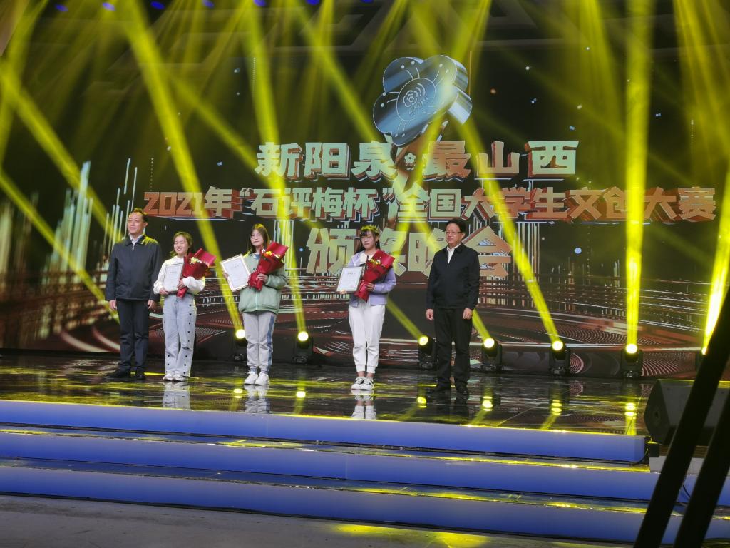 金秋十月,秋风送爽。秋天是收获的季节。10月10日晚,“新阳泉-最山西”2021年“石评梅杯”全国大学生文创大赛颁奖晚会在阳泉市广电总局圆满落下帷幕。工业系青年教师赵蓉、牛丽携6位获奖学生代表参加了颁奖晚会。本次大赛,工业系共有83名同学参加。报送了文化旅游、工艺美术、工业设计等3个类别的作品66件,其中有23件获奖。奖项有二等奖1项,三等奖3项,优胜奖6项,入围奖13项。青年教师赵蓉、牛丽获得优秀指导教师奖。收获满满,可喜可贺!