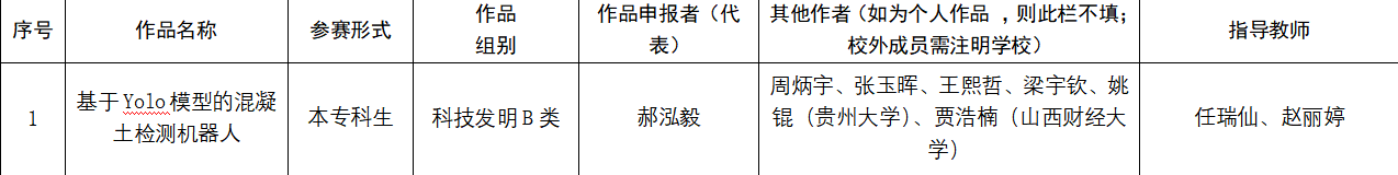 根据《“挑战杯”全国大学生课外学术科技作品竞赛章程》的相关要求,经过校级初赛、省级复赛和省级决赛的评审选拔,经竞赛组委会同意推报《基于Yolo模型的混凝土检测机器人》1件作品参加第十九届“挑战杯”全国大学生课外学术科技作品竞赛,现将晋级国赛项目名单予以公示。