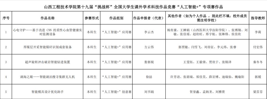 根据《“挑战杯”全国大学生课外学术科技作品竞赛章程》的相关要求,经过校级初赛、省级复赛和省级决赛的评审选拔,经竞赛组委会同意推报以下5件作品参加第十九届“挑战杯”全国大学生课外学术科技作品竞赛人工智能赛道,现将晋级国赛项目名单予以公示。