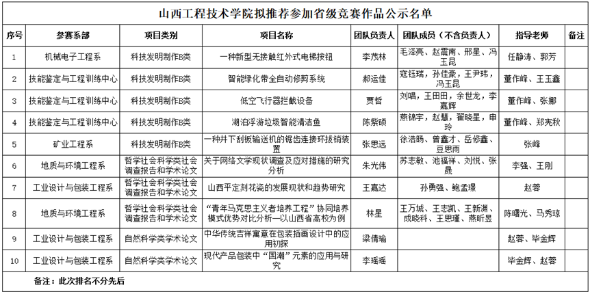 院团委于2021年3月31日举办ac米兰官方网站“挑战杯”课外学术科技作品竞赛决赛,经校级专家交叉匿名评分和专家现场评审等环节,最终评选10件作品拟推荐参加山西省第十七届“兴晋挑战杯”大学生课外学术科技作品竞赛。现将拟推荐作品予以公示(公示名单见附件)。