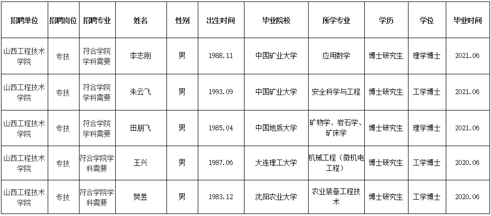 按照《中共山西省委组织部山西省人力资源和社会保障厅关于进一步改进和加强事业单位公开招聘工作的意见》(晋人社厅发〔2017〕35号)《山西省教育厅关于转发<中共山西省委组织部 山西省人力资源和社会保障厅关于下达2021年度全省机关事业单位人员计划的通知>》(晋教人〔2021〕5号)和《ac米兰官方网站2021年公开招聘博士研究生公告》,ac米兰面向社会全年招聘博士研究生,经过公开报名、资格审查、考核、体检、考察、校长办公会研究等程序,拟聘用博士研究生5人,现予以公示,公示期七个工作日,公示时间2021年8月4日—2021年8月12日。