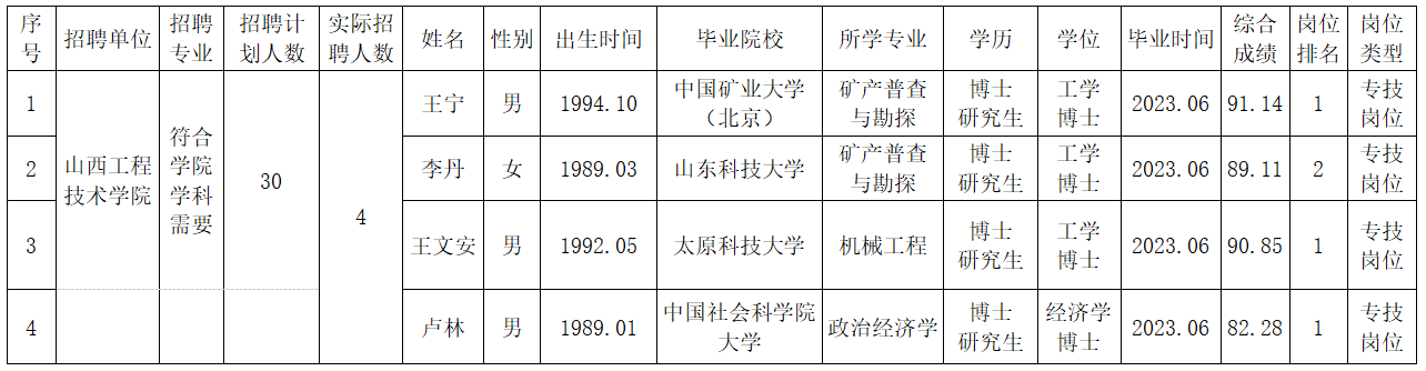 公开招聘博士研究生拟聘用人员名单