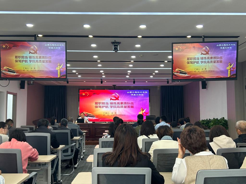 2023年,学院紧扣落实党的二十大关于全面从严治党的战略部署,健全全面从严治党体系,在“全面”上下功夫,拓展从严治党的广度和深度,把全面从严治党覆盖到党的各方面建设,准确把握高校服务“国之大者”的职责使命,把基层党组织换届作为优化党员干部队伍,切实推动全面从严治党向基层延伸的重要举措,15个党总支,84个党支部顺利完成换届工作。学院深入贯彻落实省委关于全面建设“清廉山西”的工作部署、省纪委监委相关工作安排以及省委教育工委、省教育厅党组工作要求,以“四个下功夫”全面引领清廉学校建设,持续涵养风清气正的校园政治生态,不断把全面从严治党引向深入,确保学院干部廉洁从政、教师廉洁从教、职工廉洁从业、学生廉洁修身,营造风清气正的育人环境。