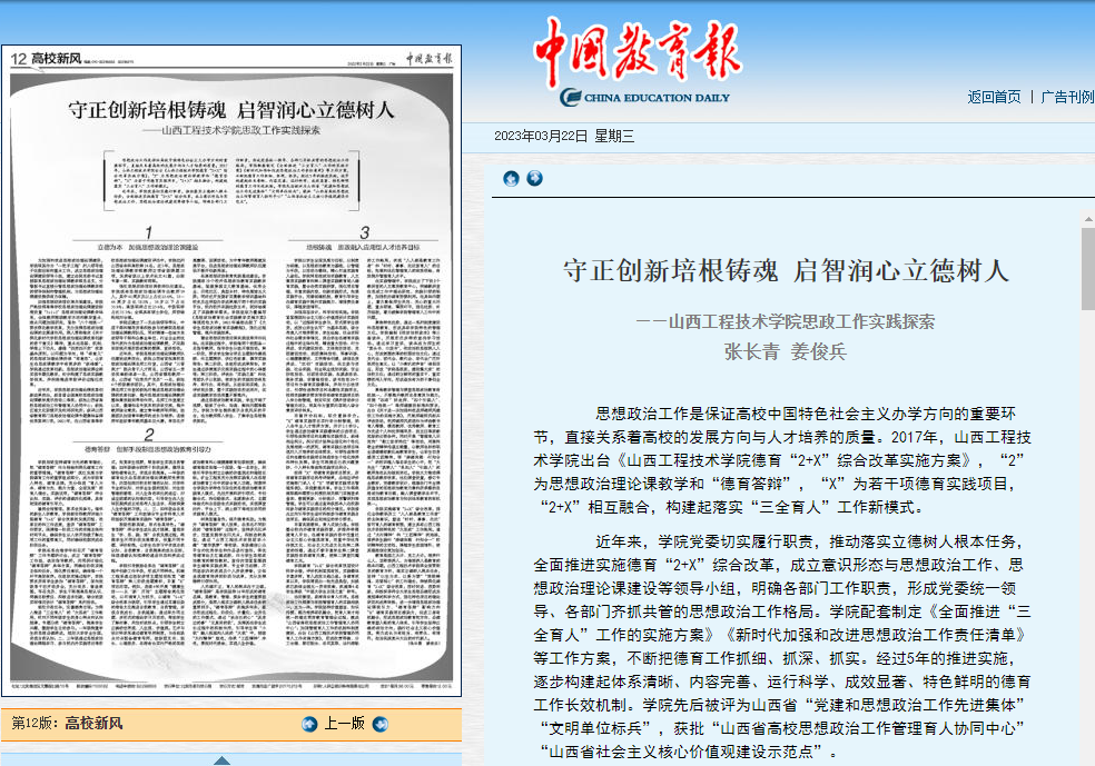 中国教育报整版报道学院思政工作实践探索——《守正创新培根铸魂 启智润心立德树人》